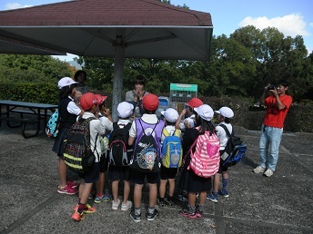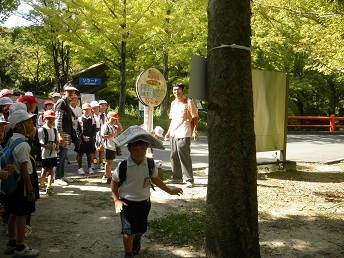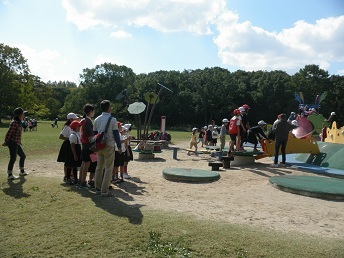 写真は各ポイントでのようすです。1枚目はわくわく池の冒険広場のポイントです。班の全員で時間をはかって遊具にチャレンジしました。2枚目はバランスリレーです。頭の上に新聞紙を乗せて木の周りをまわりました。3枚目はポンパンゲームです。タイミングをあわせて体や顔の動きをそろえます。上手にできたかな。