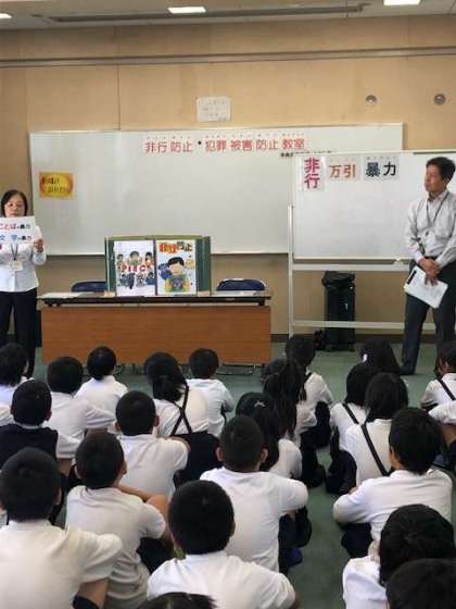 中央少年サポートセンターから支援員の方に来ていただき、5年生が「非行防止、犯罪被害防止教室」を受けました。非行をしないための3つの大切な約束や、万引きは悪い事で犯罪であり、沢山の人に悲しい思いをさせるというお話を、ペープサートなどを使って、わかりやすく行って頂きました。SNSの使い方によってはいじめにも繋がるということも教えて 頂き、子どもたちは皆真剣な表情で聞いていました。