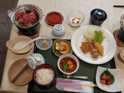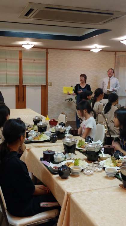 食事係さんの素敵なあいさつから豪華な夕食を頂いています。