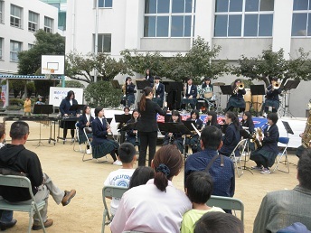 青少年指導委員によるペットボトルロケット発射でオープニングを飾りました。続いて大阪市立大宮中学校吹奏楽部の皆さんによる「ミニコンサート」です。