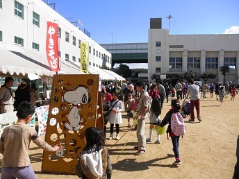 写真の1枚目は教職員によるシャボン玉、2枚目はボーイスカウトやPTA、町会による出店の賑わいです。
