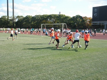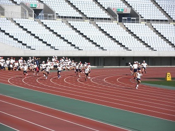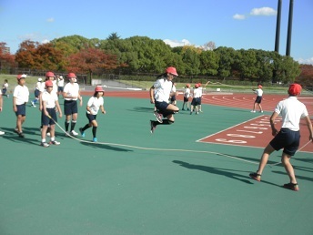 11月13日(木)に6年生が大阪市小学校総合スポーツ交歓会に参加しました。場所は長居陸上競技場および長居陸上第2競技場です。開会式後午前中は100m競走、4×100mリレー、800mジョギング走、昼食後は長なわとびの記録挑戦、サッカーとドッジボールの試合をしました。少し風が強く寒かったですが晴天のもと、元気に楽しんで運動を行いました。写真1枚目はリレー、2枚目は長なわとびの記録挑戦、3枚目はサッカーの試合で攻めているところです。