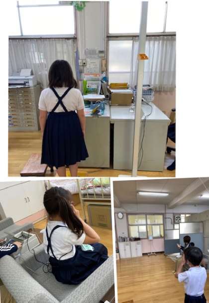 2〜3人ずつ保健室に入り、発育測定(身長、体重)視力、聴力検査をしました。