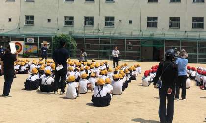 今日は避難訓練。避難の時は、前の人を「押さない」、建物内で「走らない」、そして周りの人と「おしゃべりしない」を守るようにしてください。