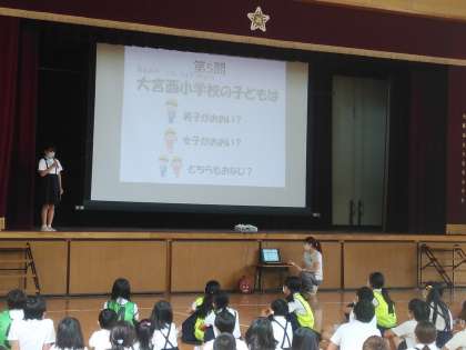 今年はコロナ感染予防対策で、児童集会を半分の人数(1組と2組)に分けて行っています。7月9日からスタートしました。1回目は「大宮西クイズ」、2回目は「何でならぼう」をしました。