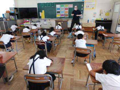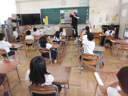 今年度から5,6年生は外国語(英語)の授業を週2時間、3,4年生は外国語活動として週1時間行っていますが、1,2年生も年に数回、外国語活動を行っています。2学期から1,2年生の授業が始まりました。それぞれ第1回目は