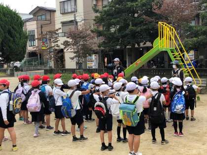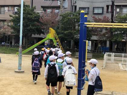 今日は、2年生が校外活動で校区めぐりをしています。校区から少し足をのばして、消防署や郵便局、警察署などを回り、学校近くのおなじみ江野公園までやってきました。
