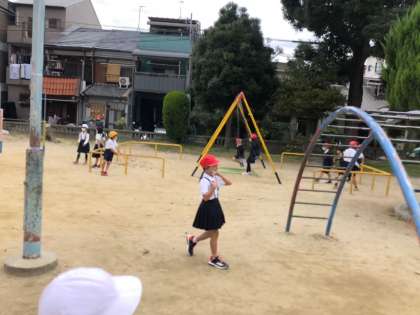 遊び慣れた公園も、学年みんなで来ると、楽しさ倍増です。