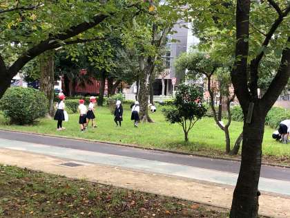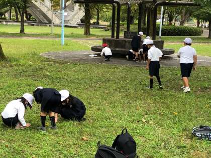 芝生の中で、バッタをとったり、ドングリを拾ったり、四つ葉のクローバーを探したり…。自然の中で色々な発見をして楽しんでいます。