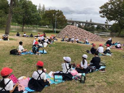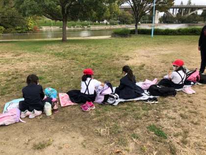 コロナ対策のため、向かい合わせには座れませんが、お友達と食べるお弁当は最高です。