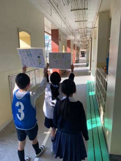 今週はけが予防週間です。休み時間には、「廊下と階段は右側をあるきましょう」とかわいい声が響いています。