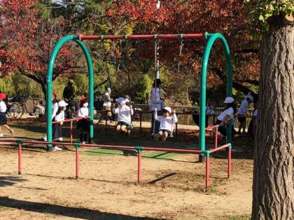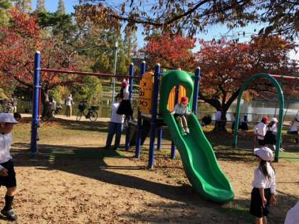 メロン滑り台にブランコなどの学校にない遊具が人気ですが、一通り遊ぶと、やっぱり鬼ごっこが始まります。