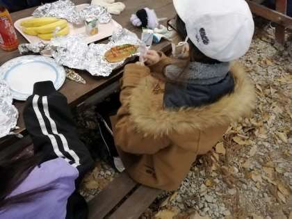パンにレタスとソーセージをはさんで、アルミホイルで包みます。