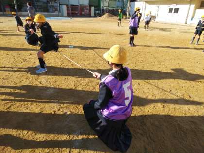 今日は2組のなわとび集会がありました。今までの集会で一番寒かったですが、子どもたちは元気に仲良く、スマイル班(たてわり班)でいろいろな跳び方に挑戦していました。