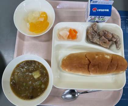 今日の給食は「卒業お祝い献立」です。「 フライドチキン、カレーシチュー、おいわいピクルス、フルーツゼリー、おさつパン、牛乳」と、豪華メニューが並んでいます。