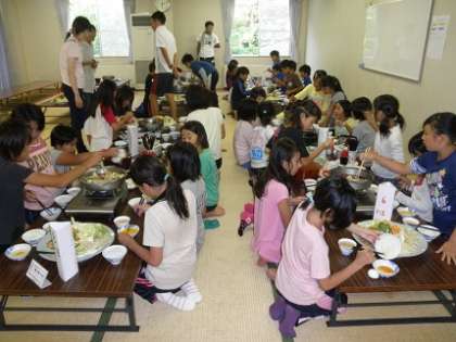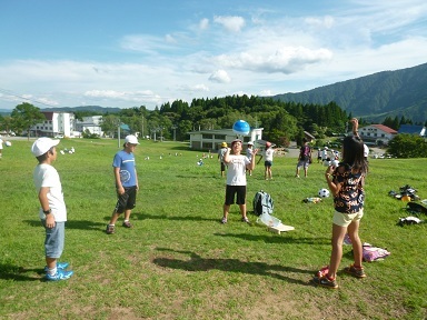 林間学習1日目の続報です。到着後川遊びをした後、午後3時頃からハチ高原をオリエンテーリングでポイント巡りをしました。写真にあるように、早く着いた班は広い草原で気持ちよくボール遊びなどをしました。入浴し、すき焼きの夕食を食べ、キャンプファイアーを行いました。約2時間全員が協力して本当に楽しい時間でした。数々キャンプファイアーも経験しましたが、最高の素晴らしさでした。