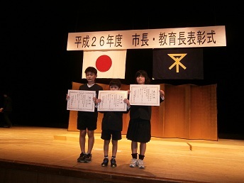 本校5年生児童北出達也さんがJOCジュニアオリンピックカップ第7回全日本ジュニアテコンドー選手権大会小学5年生男子軽量級第3位、3年生児童北出桃子さんが第31回全国少年少女レスリング選手権大会女子の部3年生30Kg級優勝、1年生北出幸也さんが2014年第3回全日本キッズサンボ選手権大会小学生1年の部22Kg級第1位の成績が認められ、平成26年度教育長表彰を受けました。おめでとうございます。2月27日(金)東成区民センターで表彰式が行われました。兄弟仲良くこれからも練習を続けて、ぜひオリンピックを目指してくださいね。