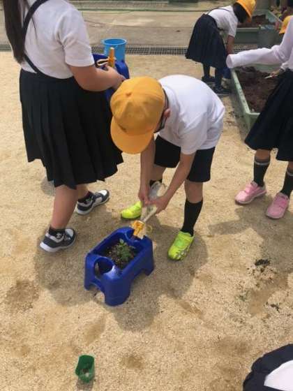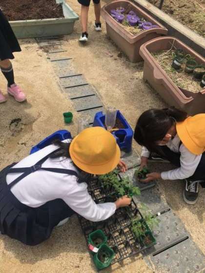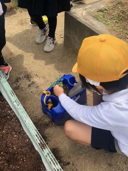 1年生のときに朝顔やチューリップを育てた植木鉢に、軽石、土を入れ、苗を優しく植えました。