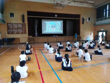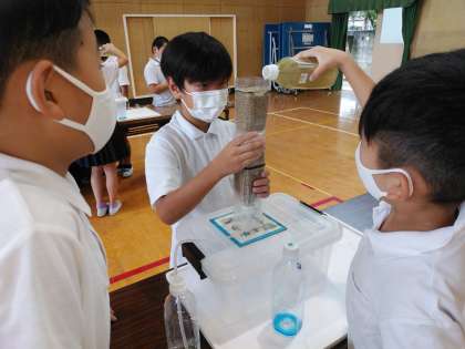 9月14日(火)の2・3時間目に、柴島浄水場より出前授業に来ていただきました。当初は柴島浄水場へ社会見学に行く予定でしたが、コロナ禍により行くことができなくなりましたので、「出前水道教室」を紹介していただき、お願いすることとなりました。水道をろ過するセットを8セット用意していただき、グループに分かれて色や臭いのついた水を透明で臭いのない水にする実験を行いました。砂や活性炭を使って、一人ひとり手順ごとに担当を決めて行いました。汚れていて臭いもしていた水が、すっかり色や臭いが消えてびっくりしていました。みんな終わった後アンケートで、「水道教室に参加して水道水へのイメージが参加する前よりも良くなった」と答えていました。