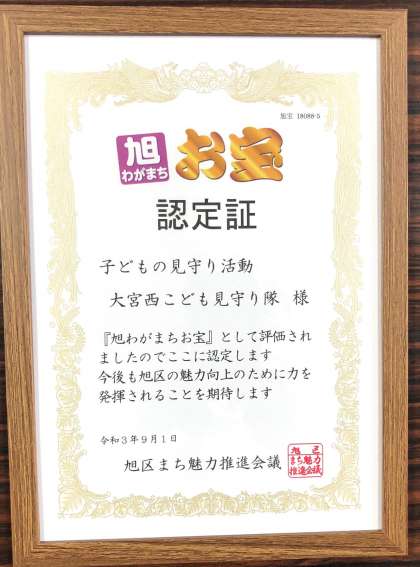 登下校時に子どもたちの見守り活動をしていただいている見守り隊の皆様が、この度、旭区まち魅力推進会議から「旭わがまちお宝」に認定され、認定証が届きました。改めて、日ごろのご活動に感謝いたします。認定証は本校玄関に掲出させていただきました。今後、旭区の広報誌等でも紹介されるようです。
