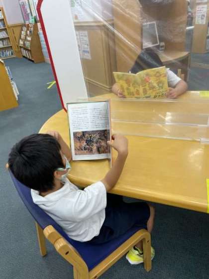 最初に司書さんから図書館の説明を聞き、次に大型絵本を読んで頂き、図書館の中の見学をしました。