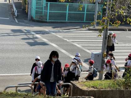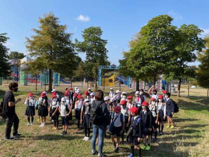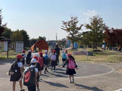 今日は、4年生が遠足で深北緑地公園に来ています。城北公園通駅から四條畷駅まで電車に乗り、1.5キロほど歩いて深北緑地内のロケット広場に到着しました。途中の電車の中や、並んで歩く歩き方など、しっかりマナーを守って行動できました。