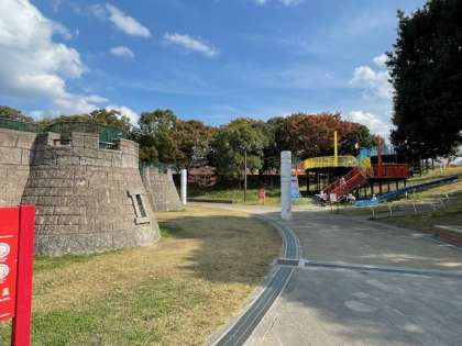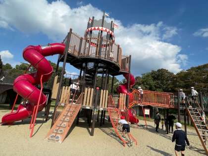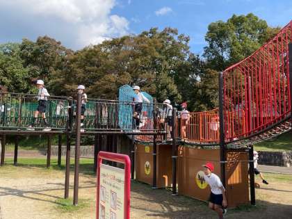 お弁当の後、少し移動して「とりで広場」にやってきました。お城の砦のような大きな施設を見て、「鬼ごっこしよー」「あのすべり台楽しそー」と、子どもたちのテンションは上がりまくり。