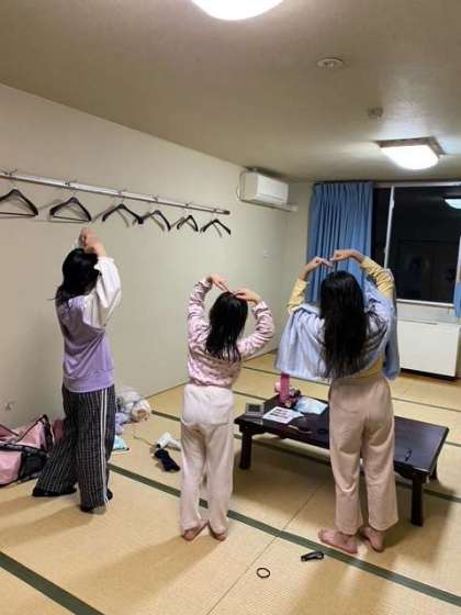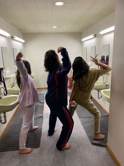 空は満天の星空。流れ星もラッキーな人は見えました。今はお風呂タイムと部屋で寝る用意などをしています。お顔が写せないのが残念ですが、たのし〜を後ろ姿で表現してくれました。