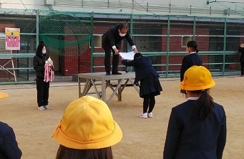旭区の子ども会キックベースボール大会で中宮のチームが優勝しました。表彰状とトロフィーを伝達披露しました。