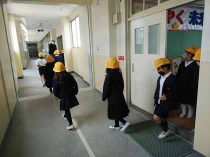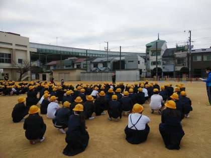 津波に対する避難訓練では、建物の中に再び戻りますが、大阪では津波が来るまでに時間は十分あるので、ガラスが散乱していたら片づけたり、倒れた物があれば移動して通路を確保したりと、安全を確保してから入るようにしてもらいます。少し時間がかかっても放送や指示をよく聞いて、落ち着いて行動しましょう。