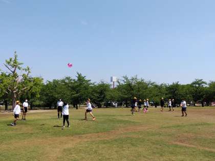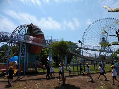 記念撮影の後、上の広場と巨大立体アスレチック(大きなすべり台)で遊びました。ビーチボールでバレーボールをしたり、鬼ごっこをしたり、すべり台をすべったり…。思い思いに楽しく遊んでいました。