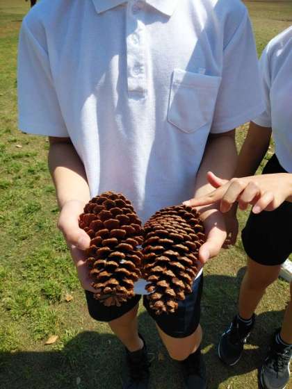 たっぷりと時間があるので、遊びも変わって行きました。長縄、ドッチビー…。中には珍しい植物や生き物を探している子もいました。とても大きな松ぼっくり、大きなミミズを見つけていました。