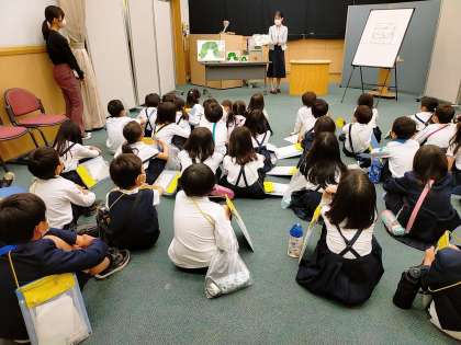 旭図書館の方から、旭図書館にある本で一番題名が長い本や、外国語に訳された日本の絵本について教えていただきみんな驚いて思わず声をあげていました。