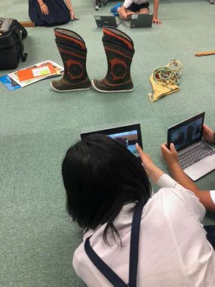 遠足で見学した民俗学博物館での学習を深めるために、みんパックというスーツケースを民俗学博物館から借りてきました。スーツケースをあけた瞬間、「わあっ」と歓声が上がりました。このスーツケースの中には、外国の文化に関するものが入っていて、子供たちはそれぞれ中をしっかりみて、それらをタブレットで写真に写しました。この後、パワーポイントを使って外国の文化について、まとめをします。
