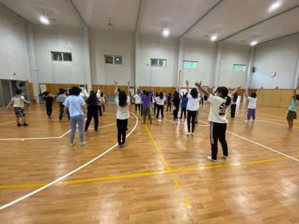 > 雨が降っているので、今日の朝の集いは体育館で。