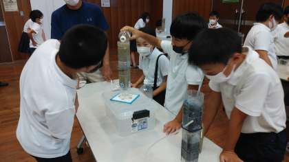 ろ過実験装置を使って川の水をきれいにする実験をしました。