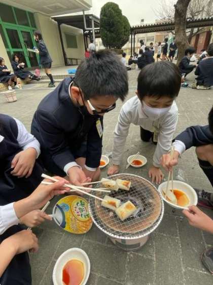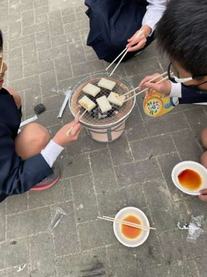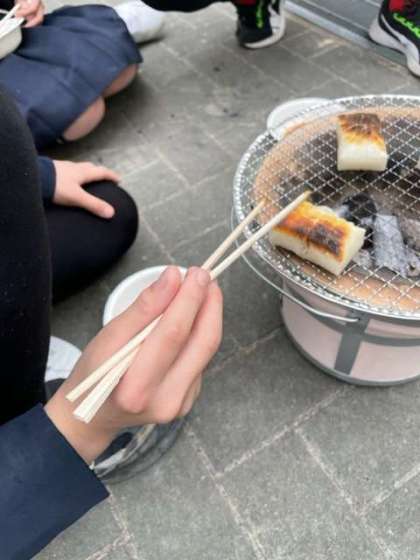 「七輪で焼いた方が美味しい」「今まで食べたおもちで1番美味しい」と子どもたちは大喜びでした。「持ち運びができる。」「電気が無くても使える。」などの意見もでました。昔からある道具、七輪の良さを体験できた1日となりました。