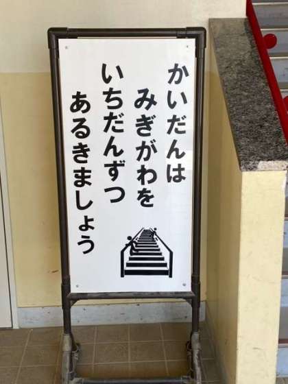 管理作業員さん、手作り看板が出来上がりました。けがをしないように、階段、廊下は右側を歩きましょう。