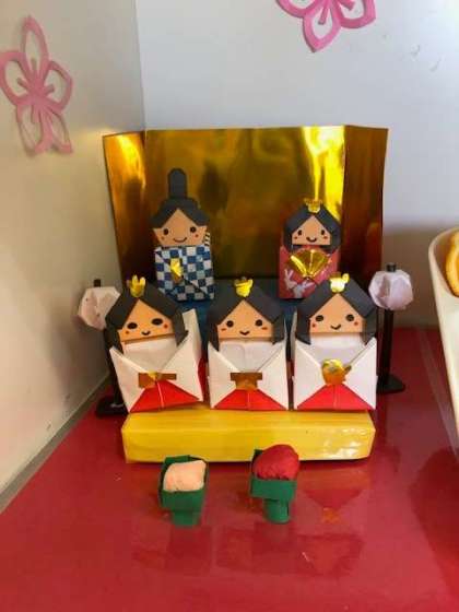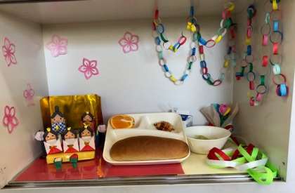 今日は桃の節句。給食室のディスプレイが新しくなりました。3月はかわいいお雛さまと卒業式の花束がモチーフです。今月も給食調理員さんの手作りです。