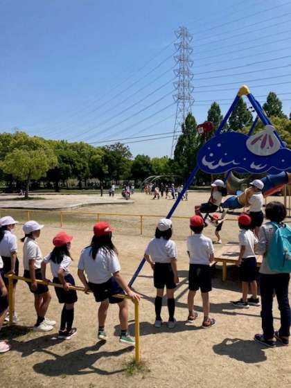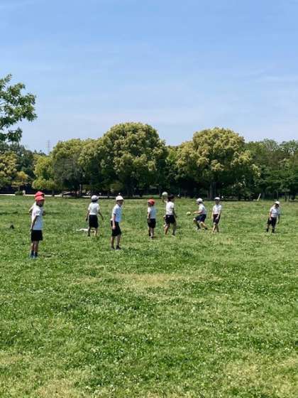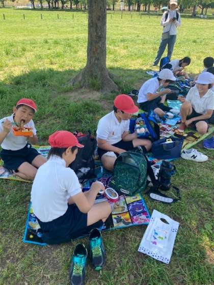おいしくお弁当をいただきました。ボールやフリスビーを使って、芝生広場で元気に遊びました。恐竜広場では、ターザンロープに長蛇の列ができました。