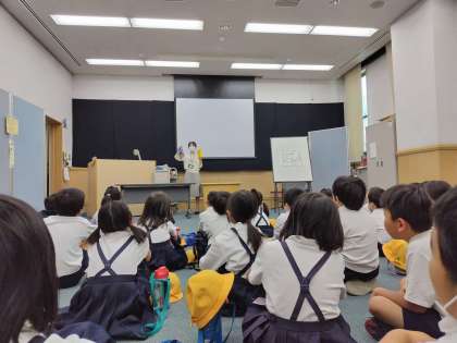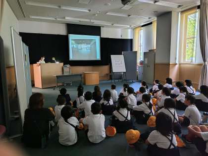 図書館の多目的室で、図書館の話を聞かせていただきました。図書館クイズもチャレンジしました。質問コーナーでは、代表の人が質問し、理解を深めることができました。