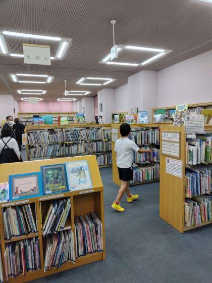次に、実際図書館の中を見てまわりました。いろいろな種類の本があることや本を見つけやすくする工夫などにふれることができました。