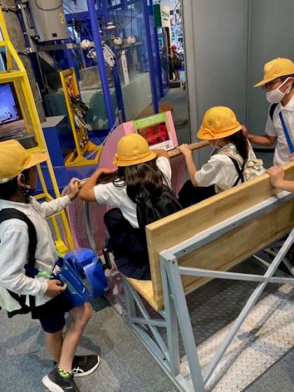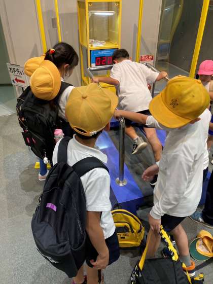 サイエンスショーでは、「空気のパワー」をテーマに目の前で迫力ある実験を見ました。手の平には、約200キログラムの空気が乗っていることや風船は、中と外の空気が押し合っていることなど、身近な物を使って分かりやすく教えてくださいました。「誰が支えている?」「空気!」のやりとりが、テンポよく繰り返され、科学の楽しさに触れる一日となりました。