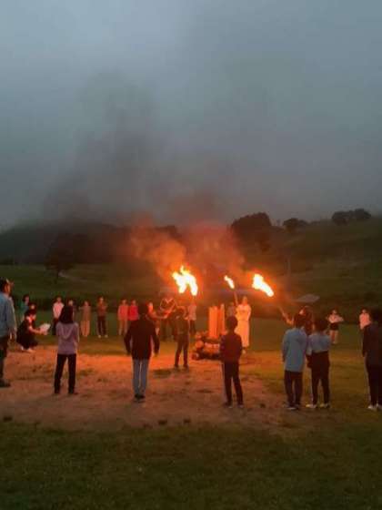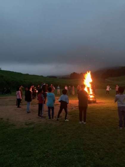 ? 火の女神のトーチから3名の5年生のトーチランナーに火が授けられました。その後、火の女神と3名のトーチランナーが点火し、キャンプファイヤーが始まりました。子どもたちは、歌を歌ったり、ゲームをしたり、ダンスを踊ったりして林間学習の目標である「自然の中で集団活動を通して仲間との絆を深めて」いました。明日、たくさんの思い出と一緒に帰校します。