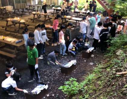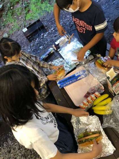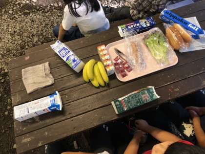 ? 3日目の朝食は、カートンドックです。ウィンナーや野菜などの具材を自分でコッペパンに挟んで、それを牛乳パックに入れ、焼いたらできあがりです。