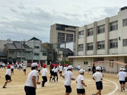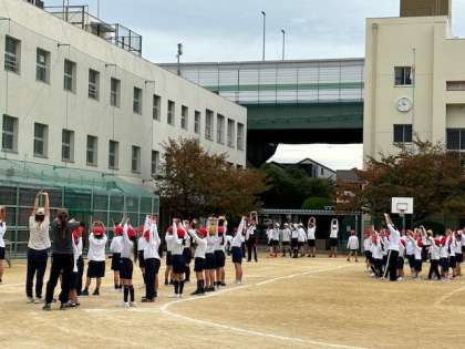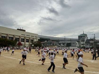 今日から、体力づくりのため「全校かけ足」が始まりました。11月30日(木)までの20分休みに、10回行います。準備運動後に音楽に合わせて運動場を走ります。どの児童も、真剣に走っていました。
