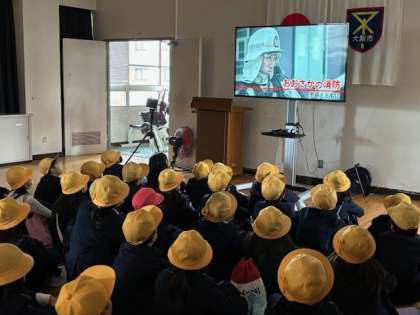 今日は、3年生の延期になっていた社会見学で、旭消防署に見学に行きました。まず、消防についての詳しい映像を見せていただき、その後に消防車を見学させていただきました。子どもたちは、初めて見る消防車の設備や車内に、感嘆の声をあげていました。
