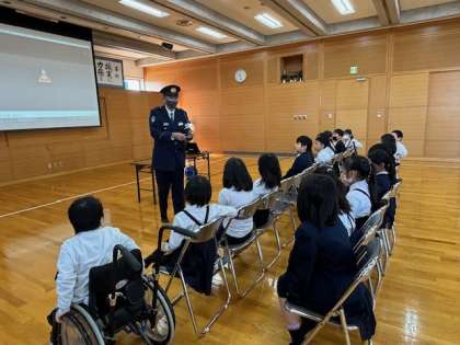 今日は、晴天の下、旭警察署へ社会見学に行きました。まずは、2組に分かれてDVD鑑賞とパトカー見学をしました。