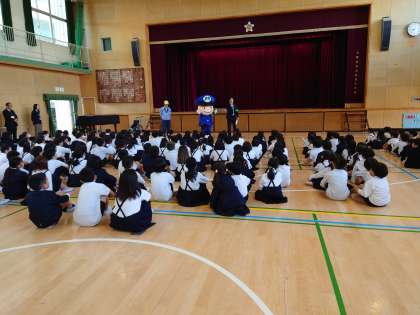児童朝会では、旭警察署のおまわりさんが来て、交通安全や防犯のお話をしてくださいました。1年生は熱心にお話を聞いていました。