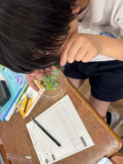 子どもたちは班の友達とわいわい話し合いながら、観察カードに記録していました。